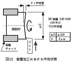 (1)旋盤のX軸の軌跡は,一般に中低に仕上がるように調整してある(図12)ため,試料Tを荒加工した際には端面が中低面(図13)に加工されていた.その中低の量は以前の実験2)より直径φ100mmで8μm程度であり,角度に換算すると0.0092度となる.