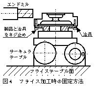旋盤加工後に,図3に示した斜線部(導波管取付部)をフライス加工により削り取った.治具をサーキュラテーブルのチャックに固定(図4)し,治具上面を平面加工した後にワークを取り付けた.