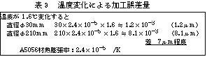 表2に示した測定結果では,エアコンの設定温度を20℃にした場合,加工物の温度は18.4℃であり,設定温度よりも1.6℃低くなった.温度変化が1.6℃あった場合,内径φ30とφ210のサイズの違いによる熱膨張で生じる誤差は約7μmである(表3).
