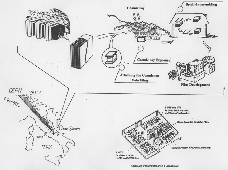 これに730km離れたスイスに設置されているセルン(CERN:欧州原子核研究機関)の加速器(SPS)で作ったミューニュートリノを2005年から五年間照射する.振動反応があったパックは,一日に最大30パックを交換する事を想定している.取り出したパックを解体してエマルションを取りだす.現地で現像した後,日本に空輸し,F研で飛跡の検出を行う.飛跡検出は一日に1,680枚のエマルションをμm単位で検出しなければならないため,高精度・高速処理の自動飛跡読み取り機の開発が不可欠である.