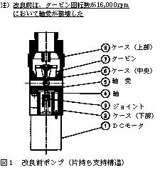 改良前のポンプ(図1)では、DCサーボモータが最大回転数(26,000rpm)に到達する前に軸受<5>の破壊が生じた。その理由は、軸受部が片持ち支持構造のため、回転の上昇と共にタービン<7>の振れが大きくなるにしたがって高負荷が加わり、軸受<5>に潤滑作用もないため破損したと考えた。そこで、軸受<5>が最大回転数時においても破損しないための改良を行った。