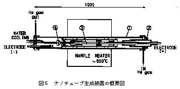 装置(図5)は、石英ガラス管<1>(外径50mm、長さ1000mm)の中に2本の炭素棒<3>(1本は金属(Ni-Y,