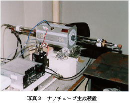 Co-Ni と Fe-Ni)が練り込まれている)を設置し、ヘリウム雰囲気(500Torr程度)中においてアーク放電させることで、ナノチューブが生成される。生成量を増やすため、放電中にマントルヒータで加熱(試料部は850℃程度)する。生成されたナノチューブはヘリウムの流れに沿って、水冷された銅製の捕集部<4>に付着する。放電により炭素棒<3>が消耗するため、ハンドル<2>により放電距離を調整できる構造にした。尚、放電電源にはアルゴンアーク溶接機(150V,60A)を使用した。写真3にナノチュ−ブ生成装置を示した。