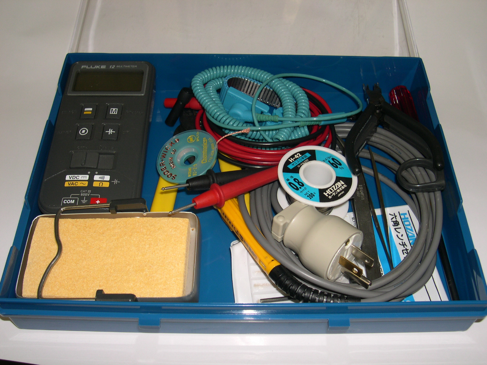- ハンダごて:回路部品のハンダ付に使用し、15W程度の小容量でアース付きのもの